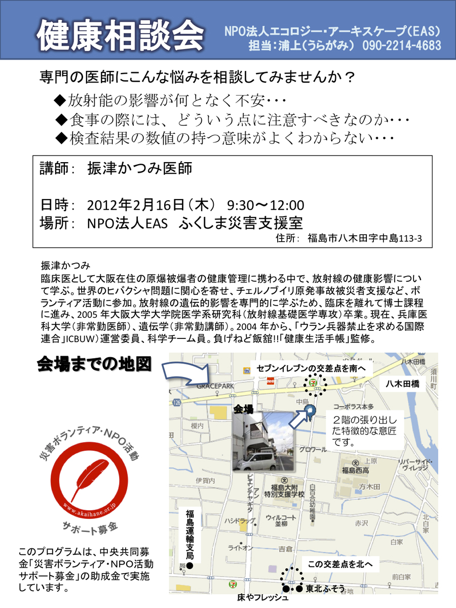 ■2012年2月16日(木)ふくしま災害支援室で健康相談会を開催します。